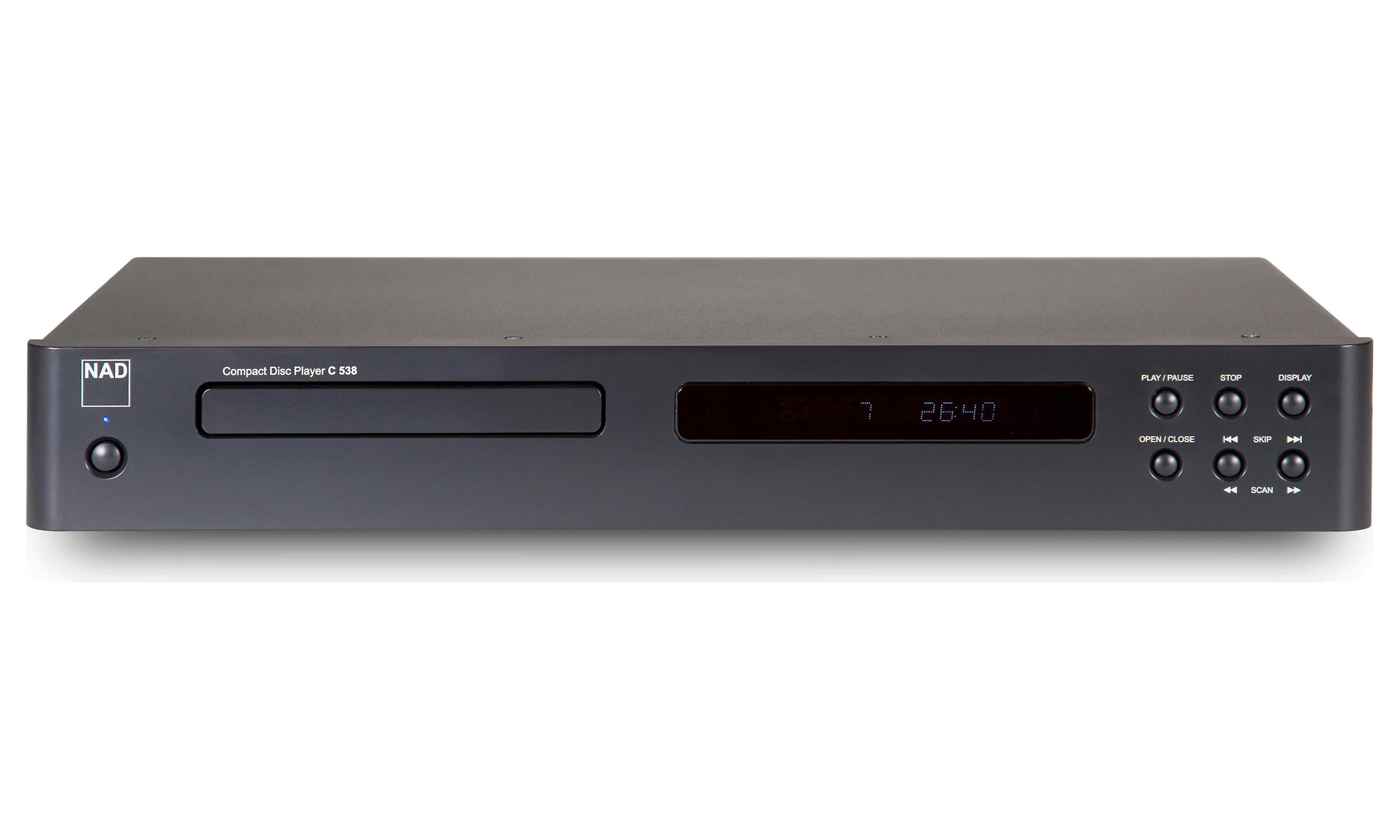 The NAD C 538 includes many desirable features that enhance listening pleasure. Front panel controls are duplicated on the hand held remote allowing Play, Pause, Skip, and Scan functions. In addition, many more features are available from the remote handset, such as RANDOM: Tracks/files are played at random mode, PROGRAM: Enter or exit program mode, REPEAT: Track, file, folder or whole disc is repeated, RPT A-B: Playback sequence is repeated. The dimmable dot matrix display shows tracks, total playing time. Track time, disc time, and remaining time are all available. The C 538 also can play CD-R/CD-RW discs allowing you to burn songs from your computer for playback on your CD Playing system.